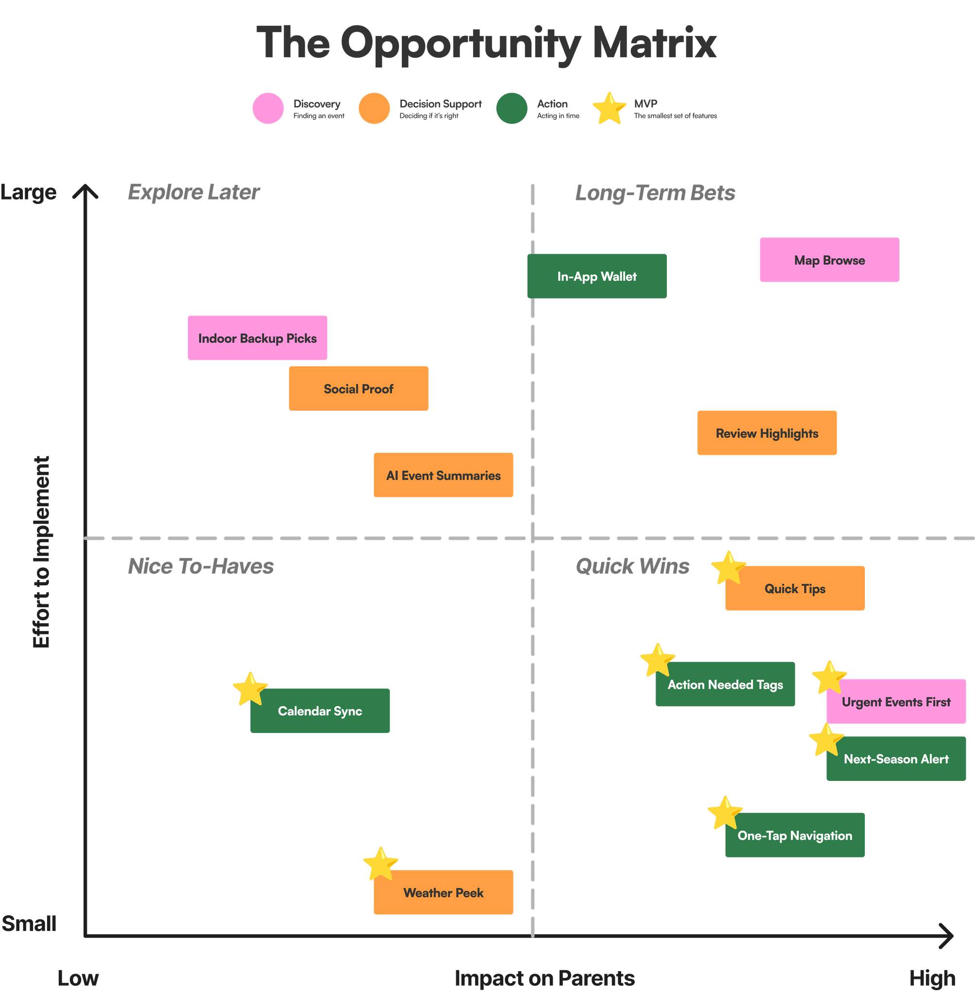 To do that, I looked at the parent journey in three simple stages: finding an event, deciding if it’s right, and acting in time. I listed ideas across each stage, then weighed them based on how much they could help parents versus how complex they would be to build.