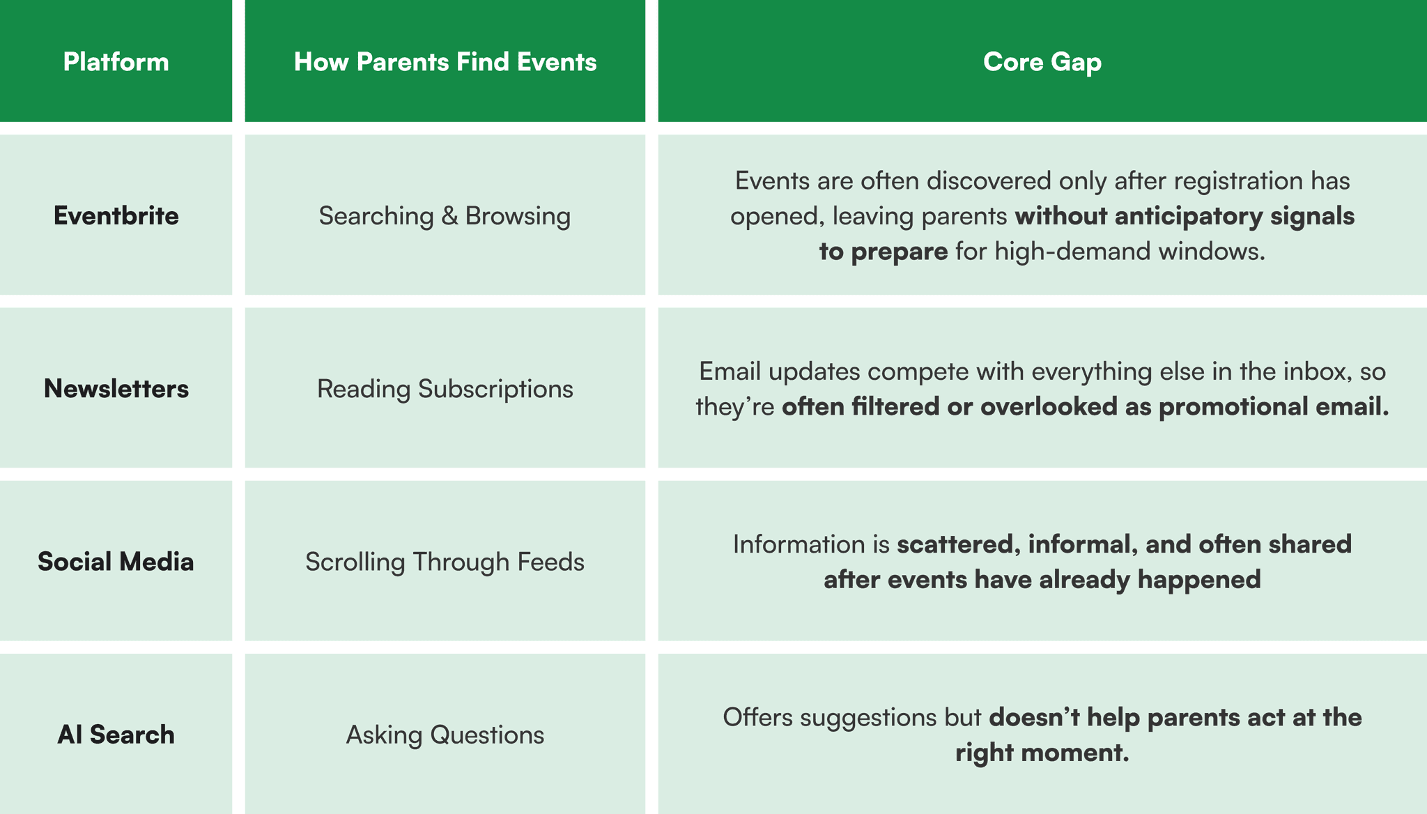 By combining user interviews with this platform analysis, one core problem became clear: discovery is not connected to timing or action. Across platforms, parents can find plenty of great events—but they don’t get early signals or decision-ready details before it’s too late.