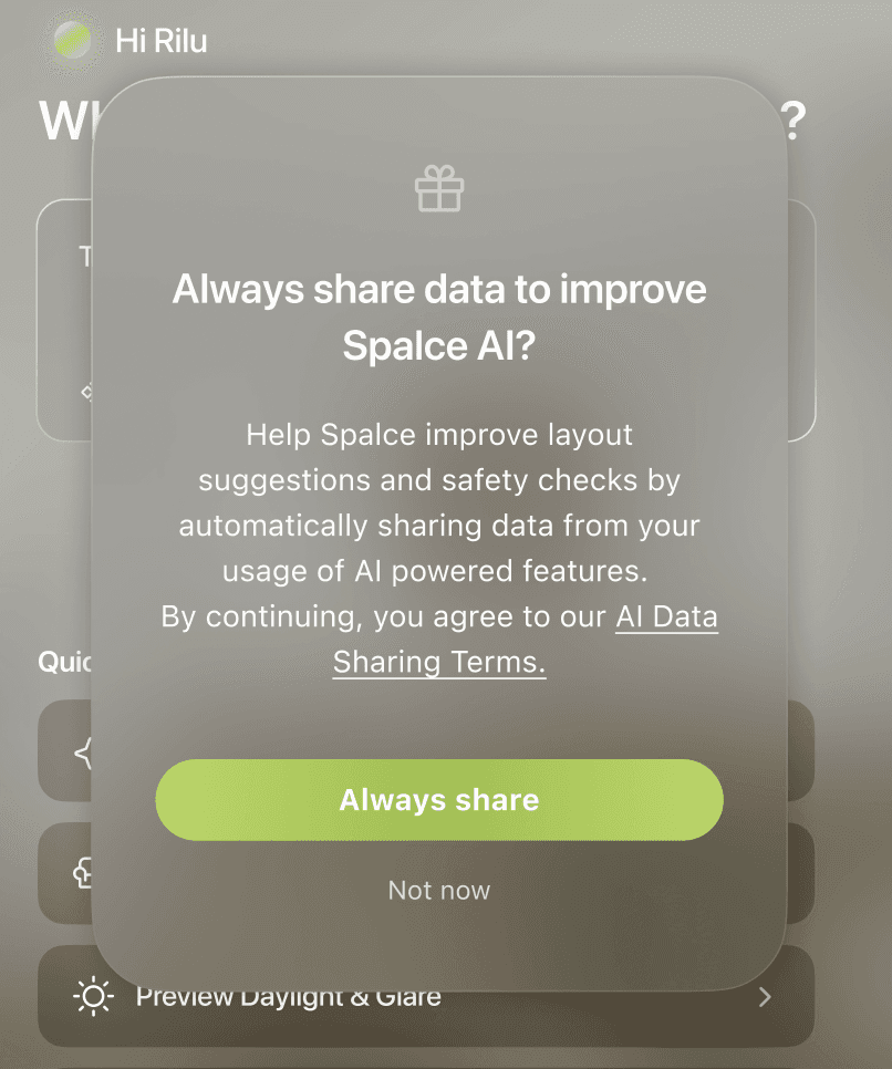 Spalce clearly explains AI data sharing and gives users control with options like “Always share” and “Not now.”