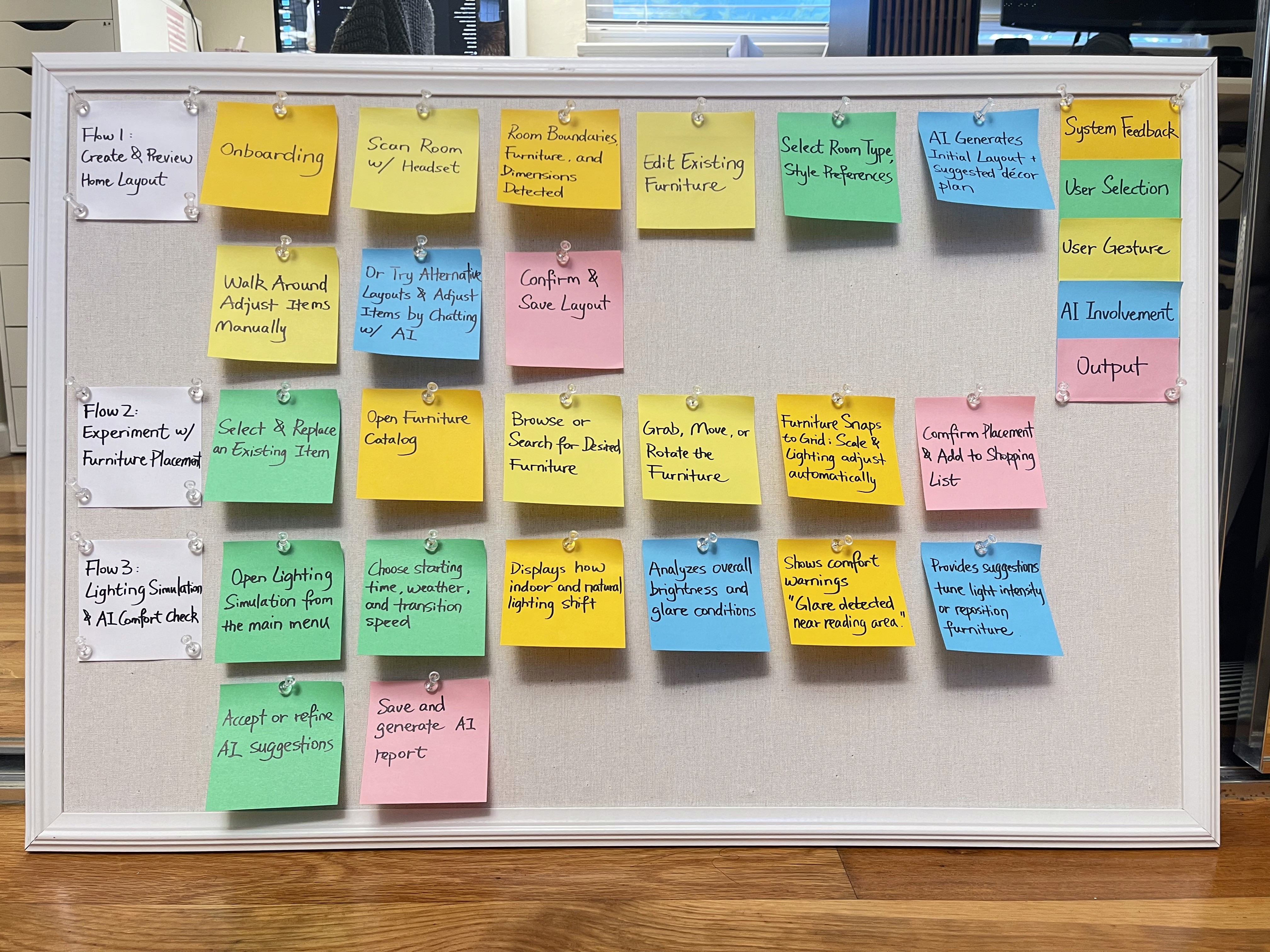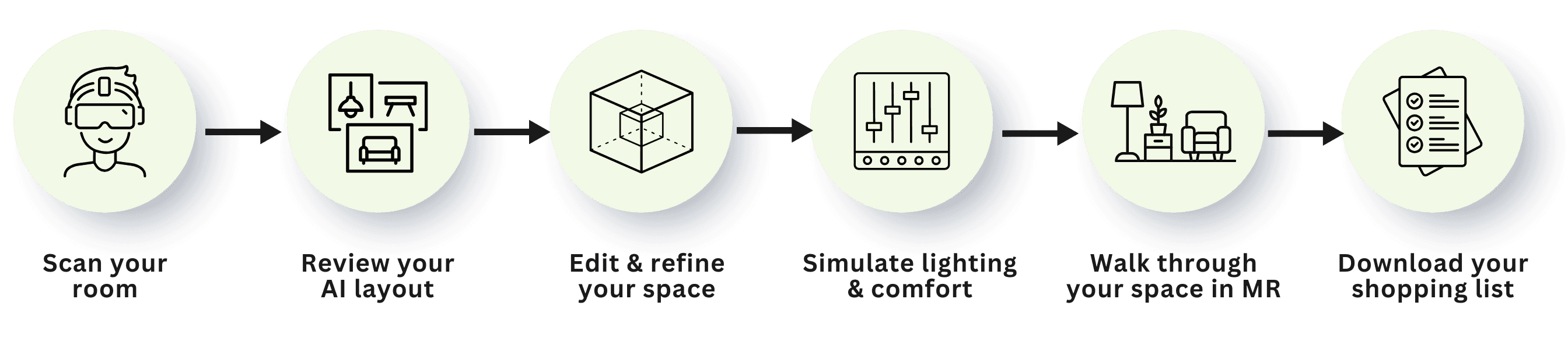 A seamless spatial workflow that transforms real rooms into testable futures—guiding users from capture to full-scale validation.