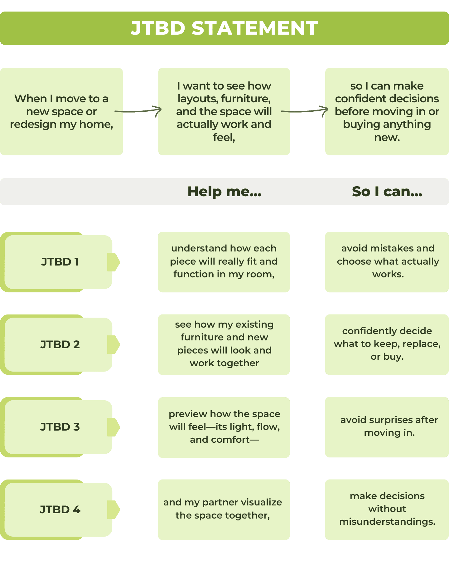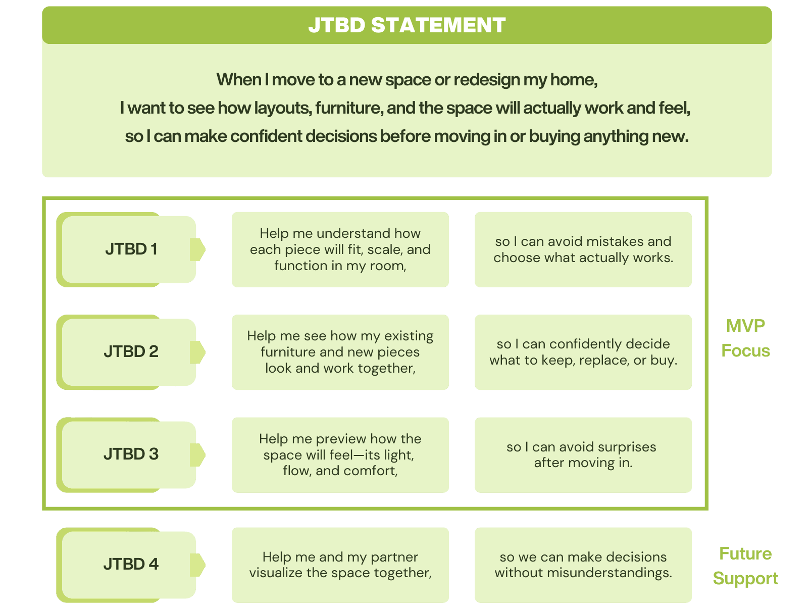 Rather than jumping directly to features, I focused on what users were actually trying to decide and validate before moving in or buying new furniture. To ground these decisions, I used the Jobs-to-Be-Done (JTBD) framework to stay centered on users’ real goals instead of surface-level feature requests.