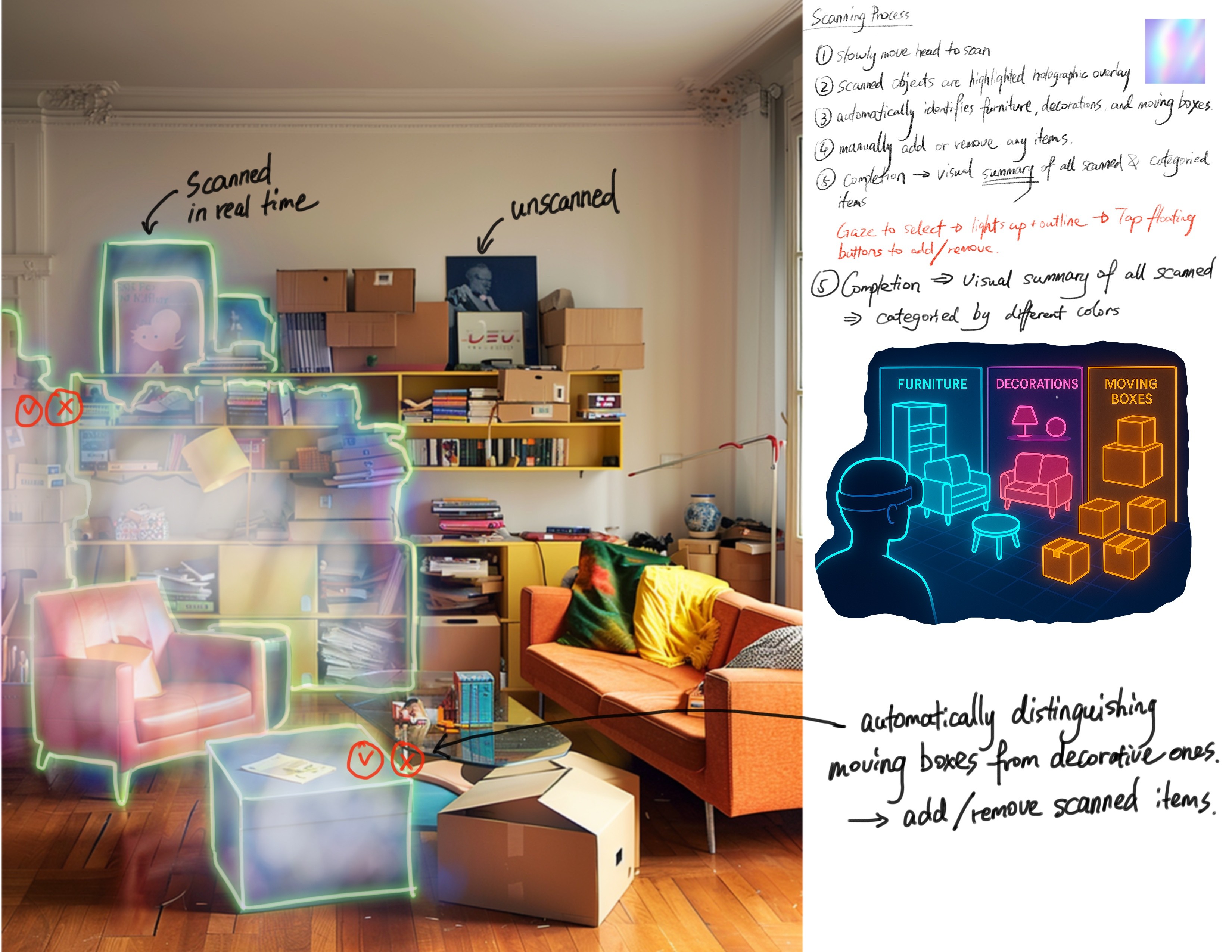 This process helped me align system perception with how users already think about their space—what feels movable (such as sofas, tables, and chairs), what feels fixed (such as walls, windows, and doors), and what should or shouldn’t be included in layout decisions (like moving boxes or temporarily stored items).