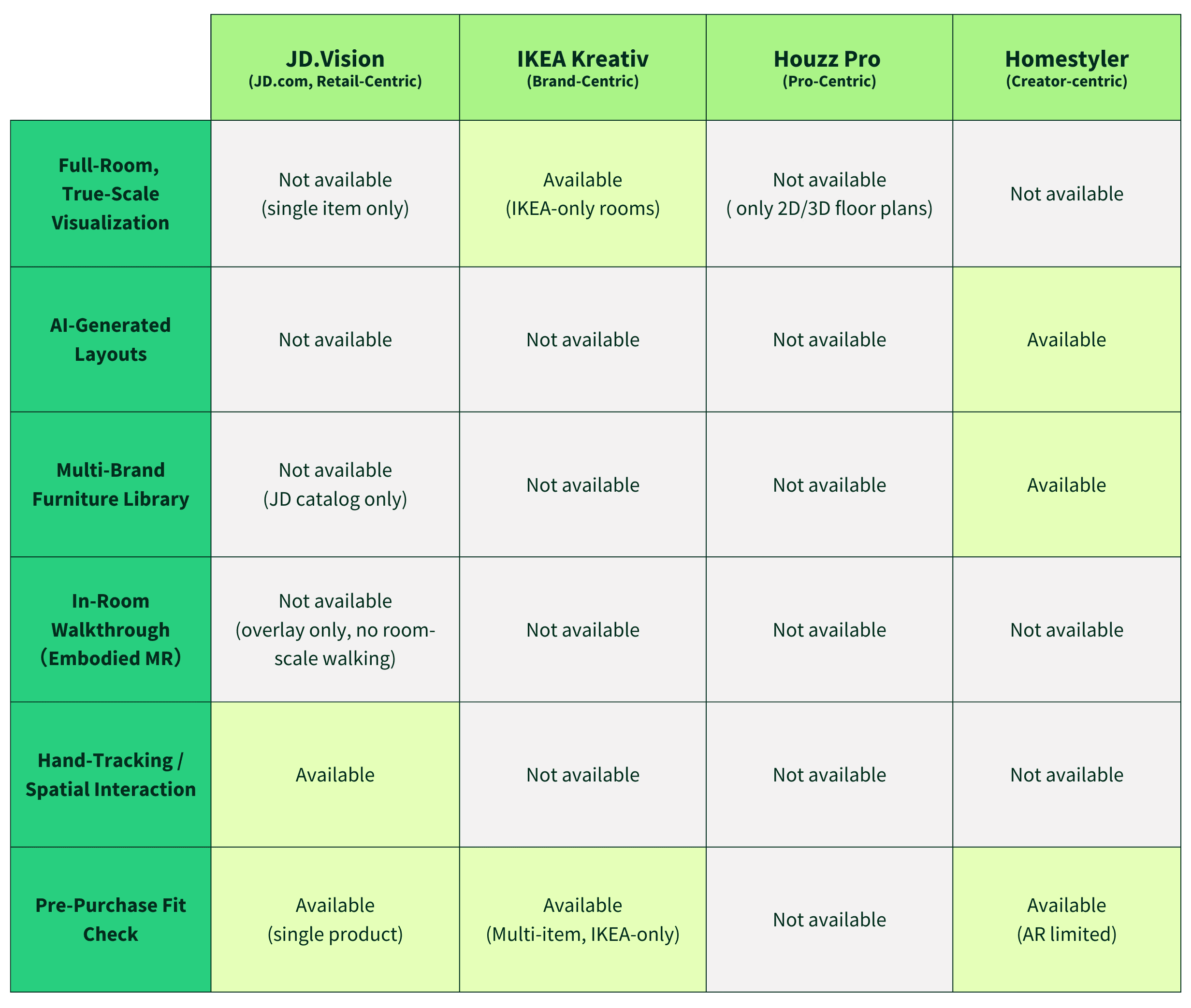 I conducted a competitive analysis to understand where existing tools fall short and where Spalce could offer something meaningfully different. The matrix below summarizes the most relevant feature gaps and opportunity areas.